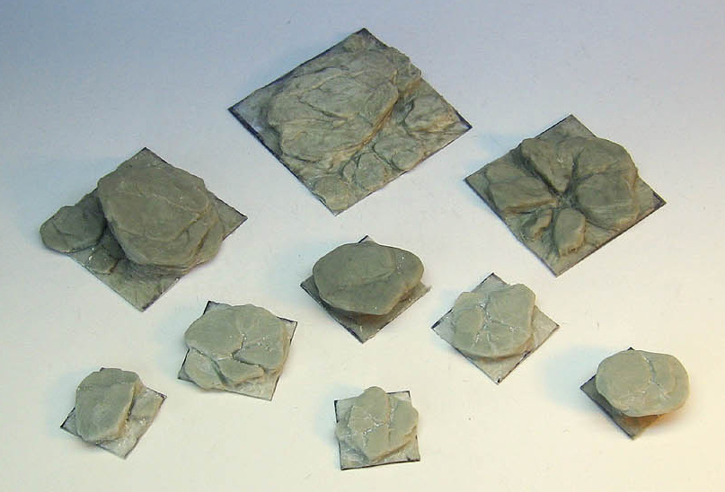 Today's base designs were created with two very different materials. The first set, ruined buildings, was made with baked sculpey. I took pieces of sculpey that were roughly 1/8th inches thick. I carved the brick texture and the cracks to get the texture. The free standing walls were made separately, so that I had the option of placing them where needed, or not at all if there was not enough space. Some paper clips were used for rebar...