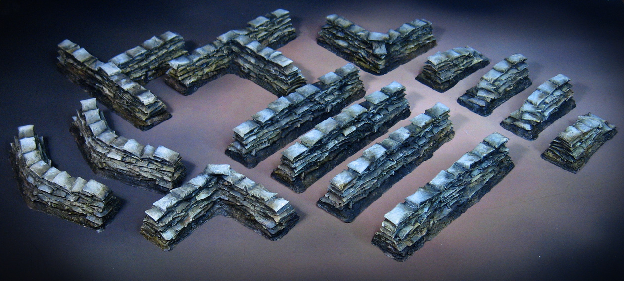 Brand new from Secret Weapon miniatures, we have a sandbag terrain set! The production set has seven pieces total. They are all cast in resin, with the usual super fine quality.