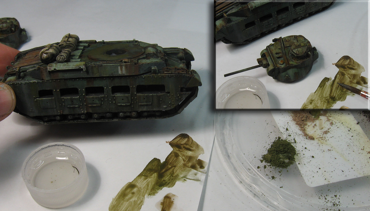 Now it's time to have fun with the powdery effect! I used a mix of the light and dark dust on the upper surface of the hull, making it collect in recess areas, as dirt would do. I also gathered up splotches of dust and dirt in the tracks and on the vertical sides of the hull (see insert).