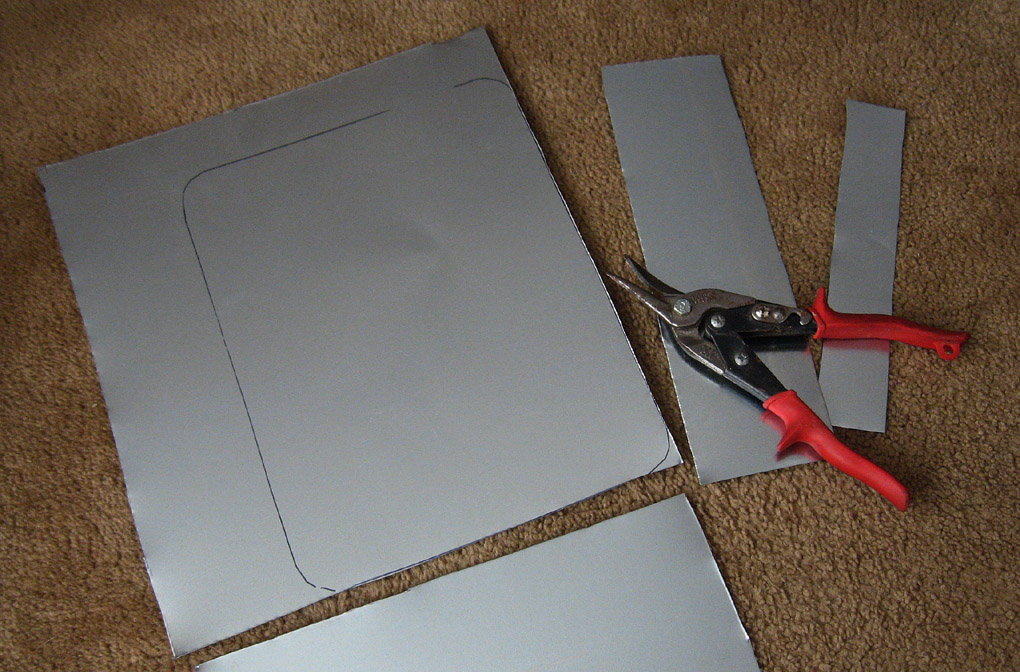 When we had our furnace replaced last winter, I took minor solace in that I was able to "requisition" a large chunk of left over sheet metal. You can find smaller pieces at any kind of home improvement or hardware store. There are even pieces of metal at Hobby Lobby these days.